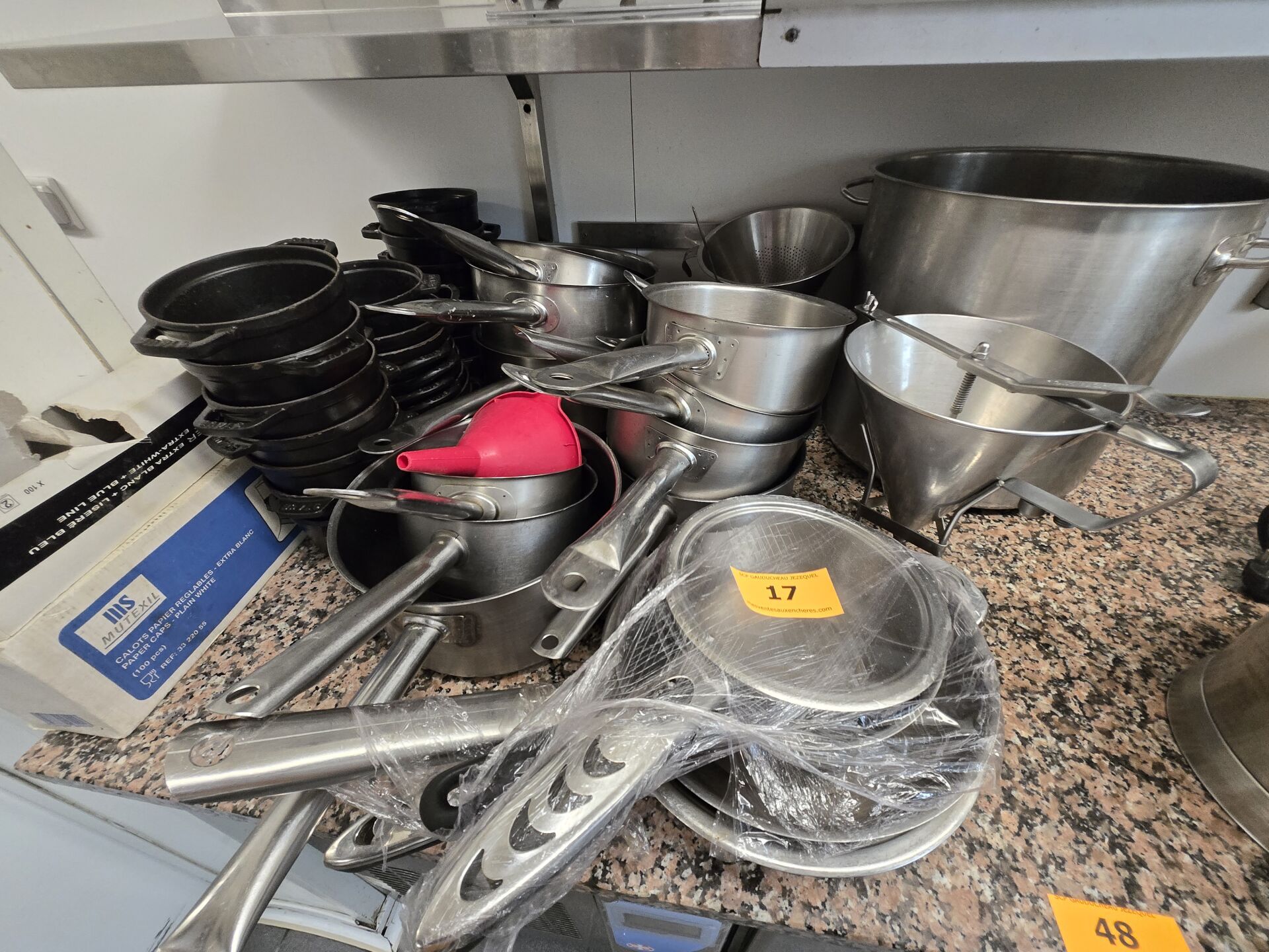 Ensemble d'environ 17 casseroles, 23 cocottes en fonte, faitout, chinois, saucière
