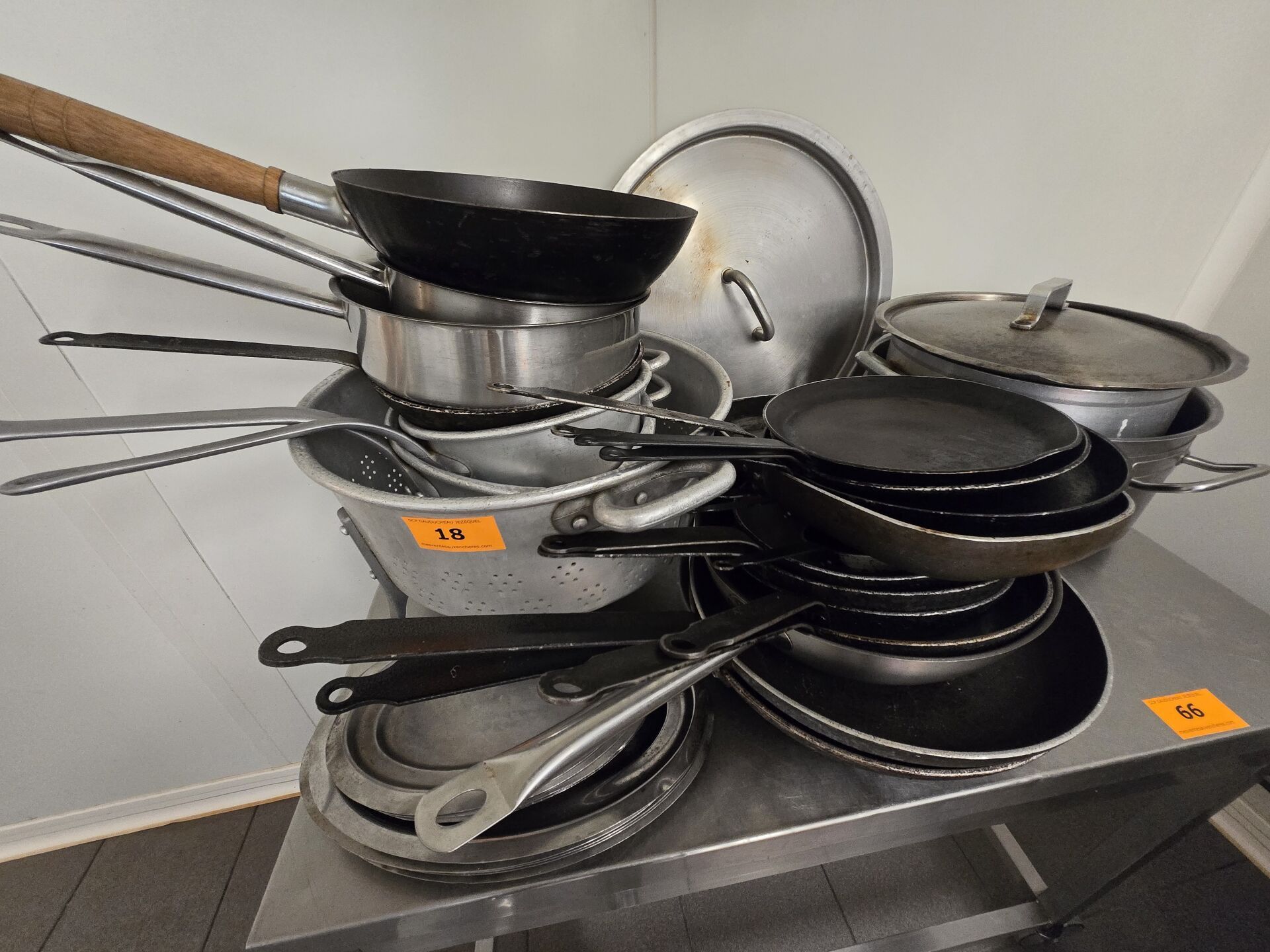 Ensemble d'environ 18 poêles, 2 faitouts, 3 passoires, petit plat inox, couvercles