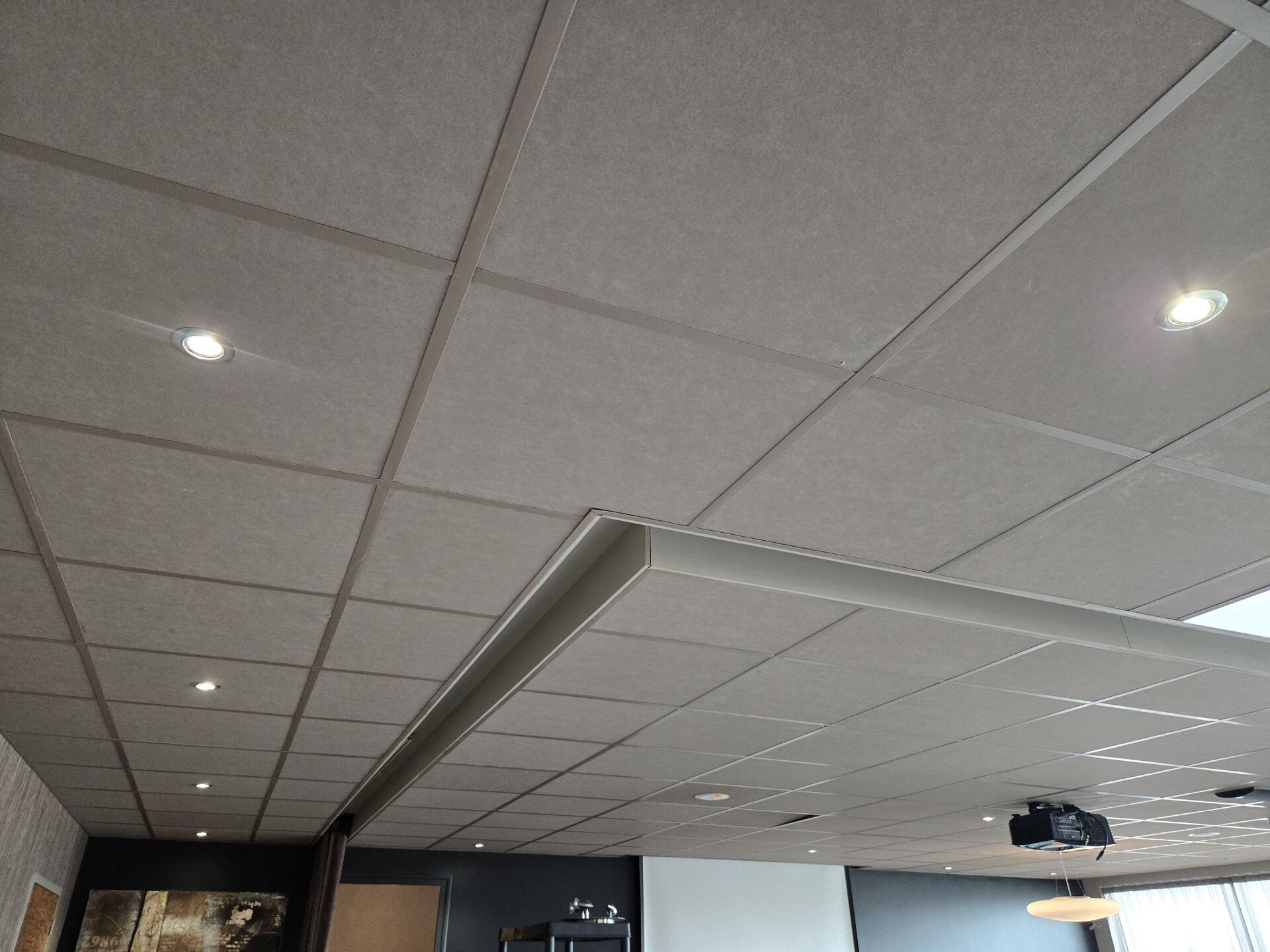 Faux plafond beige (8.00 x 13.80), dalles et traverses avec isolation IBR/laine de verre 200