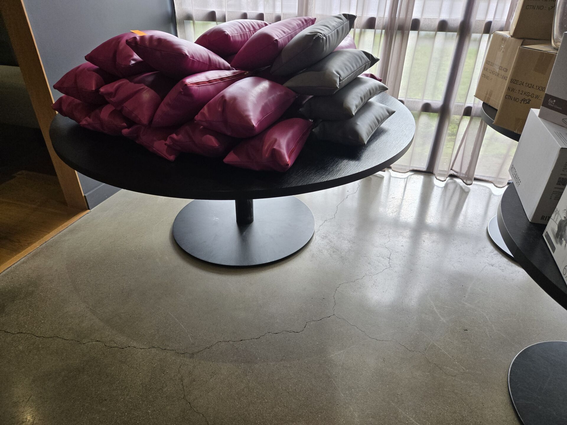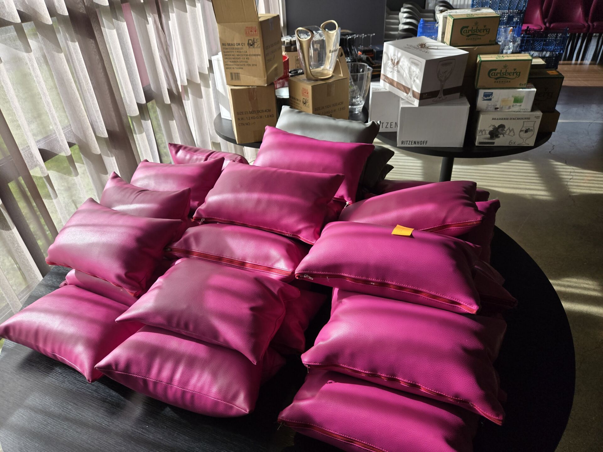 Environ 36 coussins fuchsia et gris.