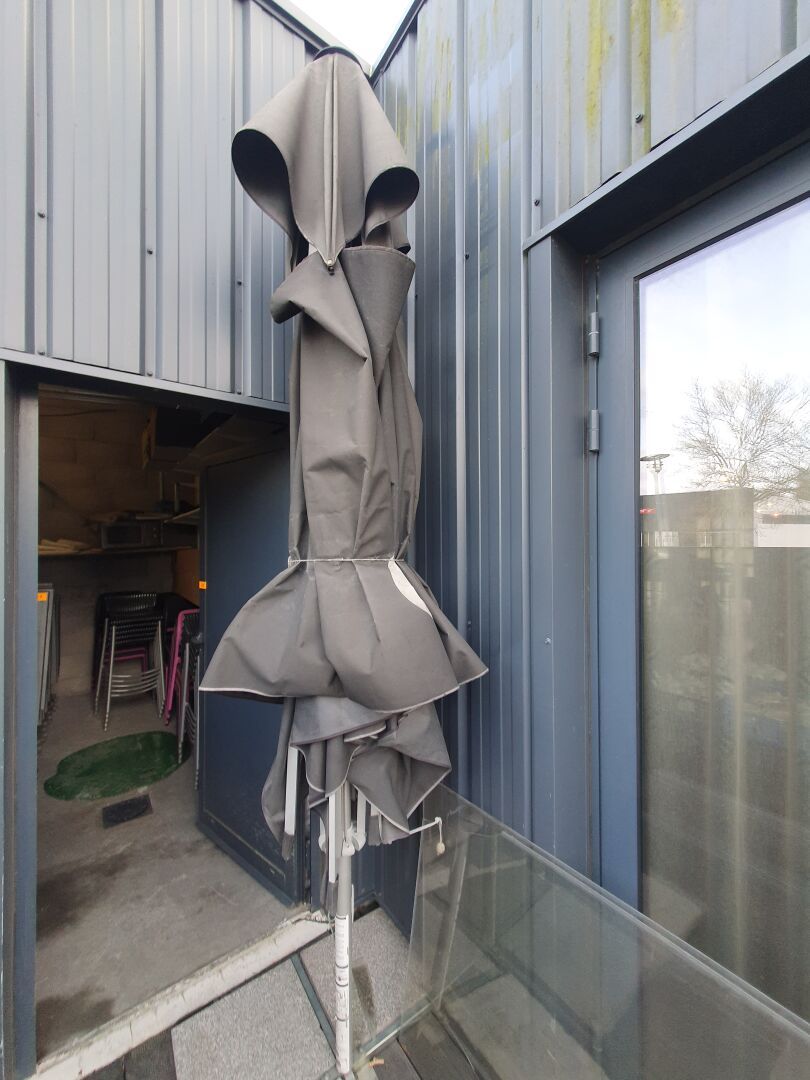 7 Parasols logotés dont 2 neuf en cartons et 5 pieds
