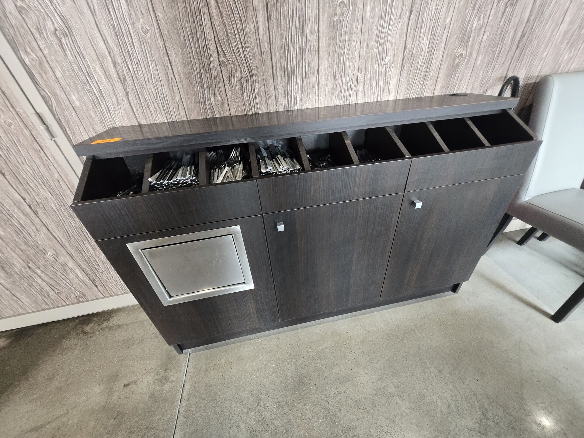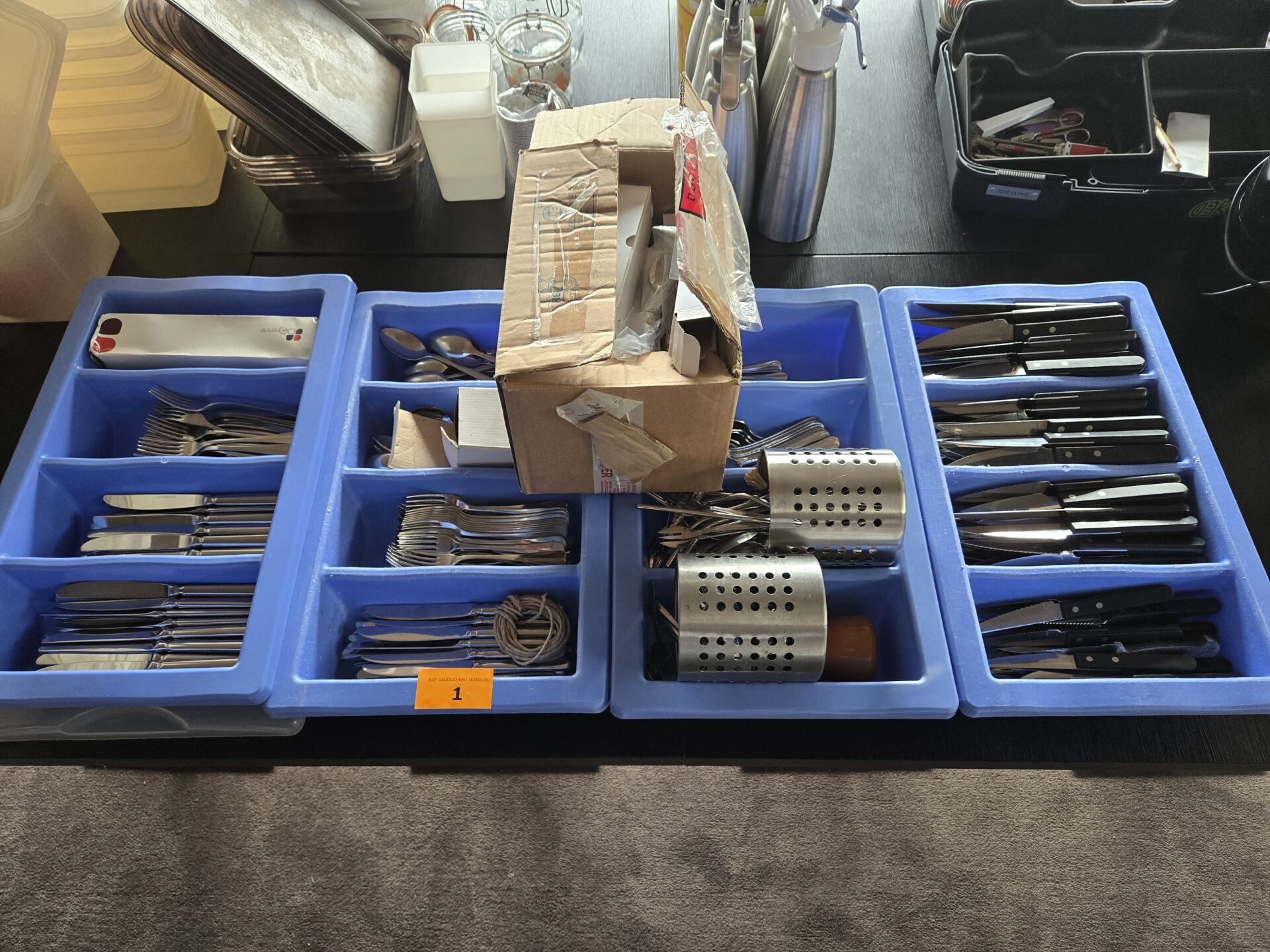 4 Bacs à couvert garnis de couteaux, couteaux à viande, fourchettes, petites cuillières