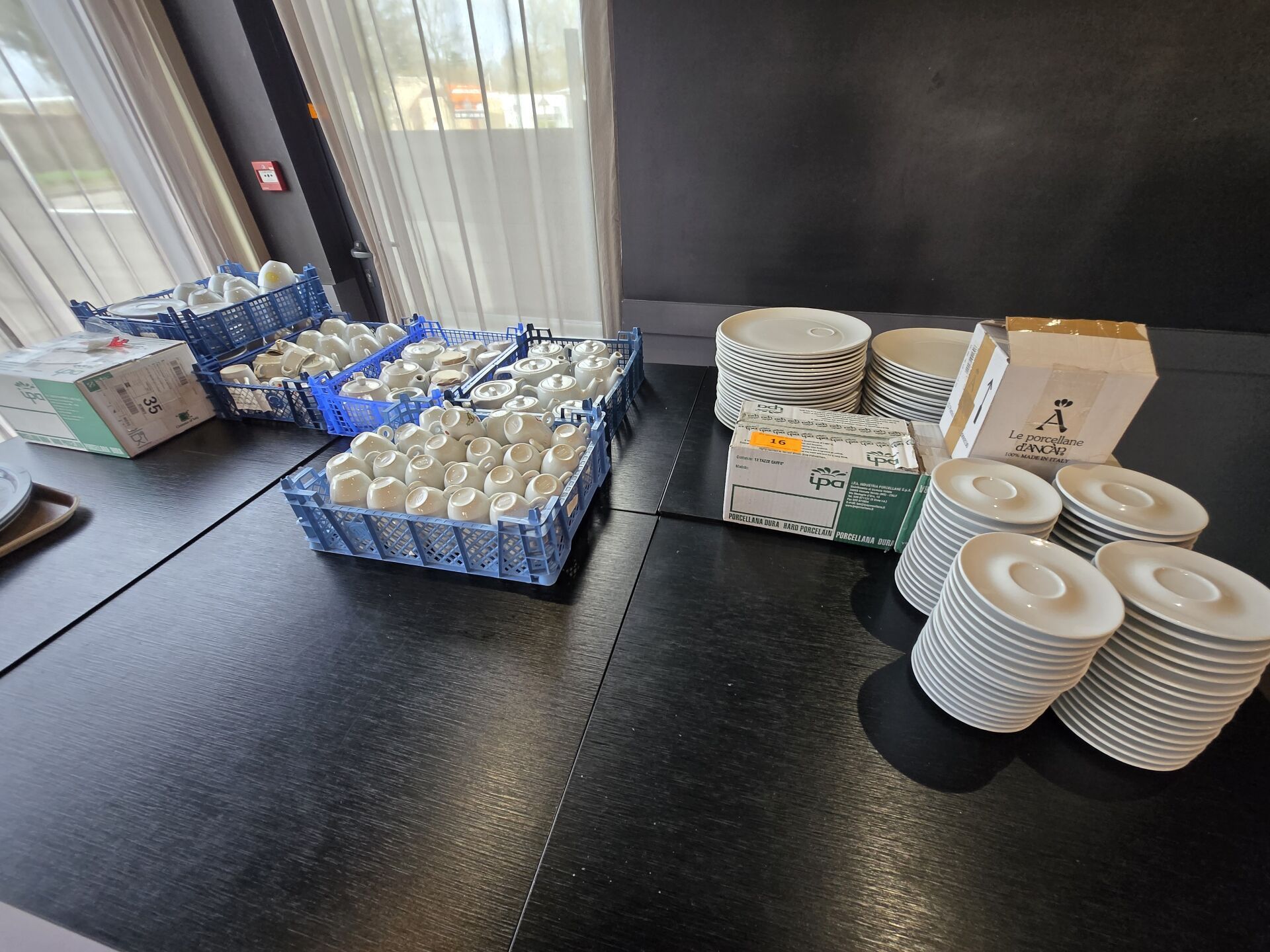 Ensemble d'environ 44 assiettes à café gourmand, 104 sous-coupes, tasses à café, théières, plateaux
