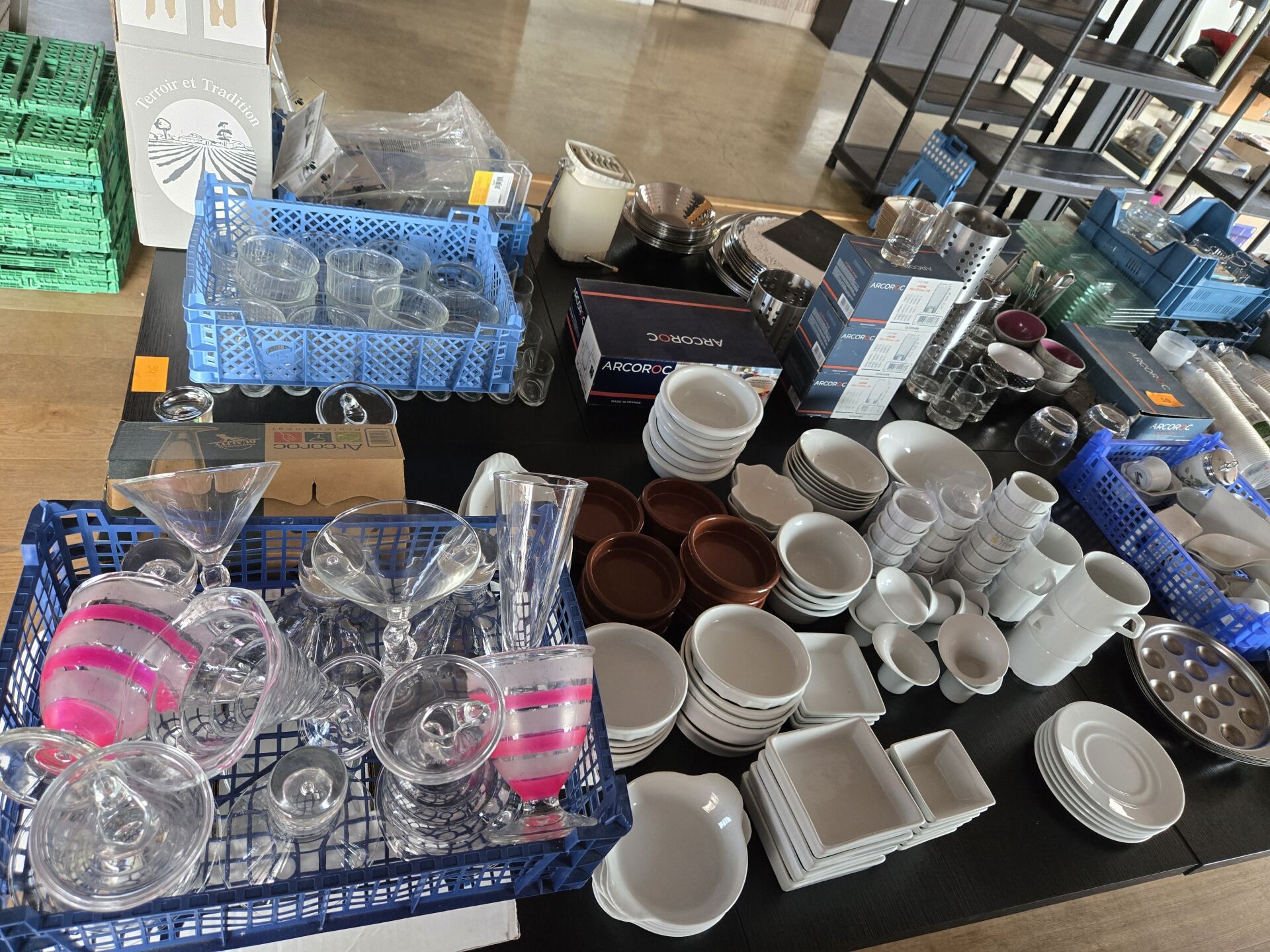 Ensemble de ramequins, coupes à glace, verrines, salières et poivrières, gobelets plastiques, plateaux, carafes