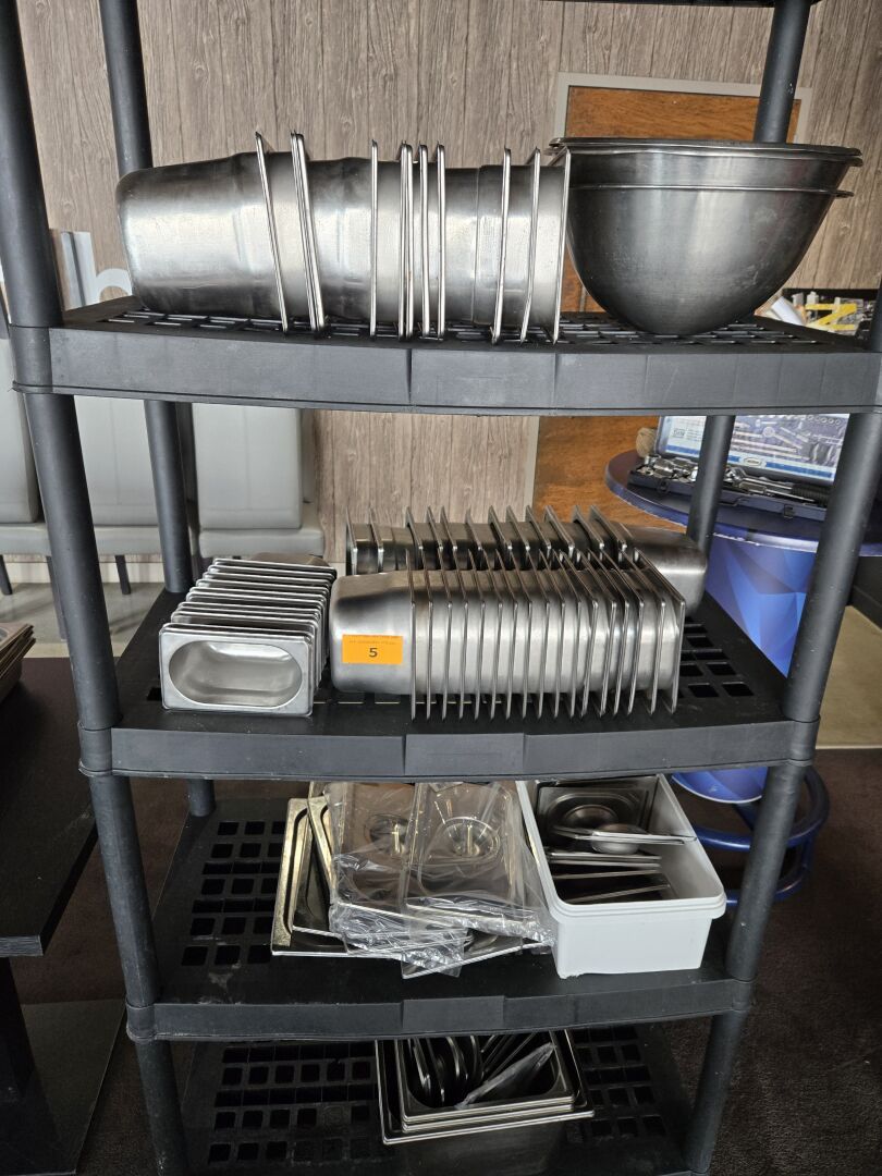 Environ 46 plats gastro avec environ 10 couvercles, 12 plaques de cuisson et 1 grille